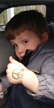 Katie helped afix a “peace” tattoo to Bobby’s hand yesterday (see photo to the right).