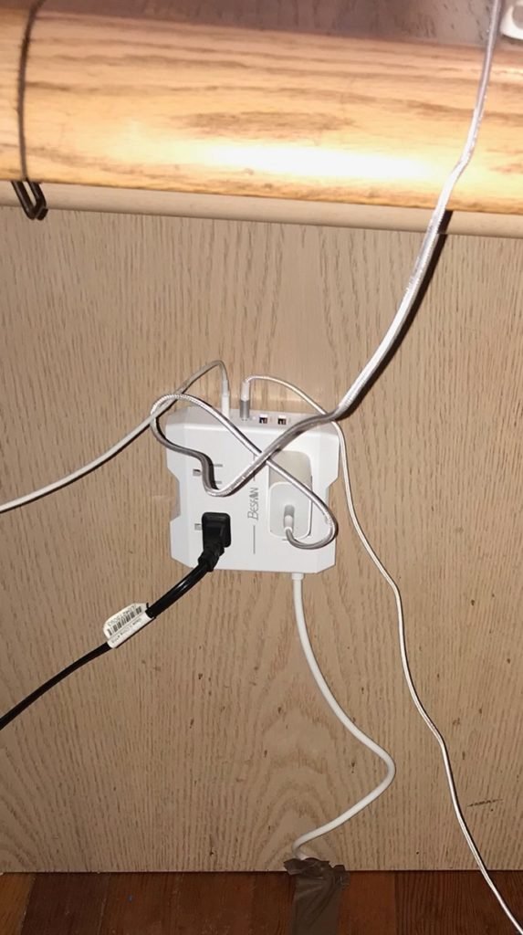 My wife organized the cords under our dining room table with a circuit “octopus” (see photo to the right).