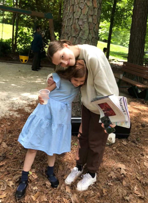 Katie wanted to have a “play date” (do we still call them this at this age?) with Greta today, but first up, she needs to accompany Miss Patricia at her “Concert In The Park”. Since Miss Patricia can’t get a piano to the park she is depending on Katie’s viola to help out. Little Kate came over to say bye to Katie (see photo to the right).