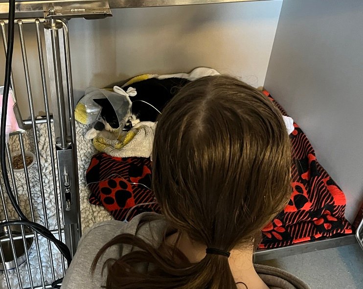 Our appointment was to see Batman at noon, and since he was still groggy from the surgery, we went to see him in his cage in the back (see photo to the right). They put him in a large dog cage for some reason, perhaps because they were out of cat cages?