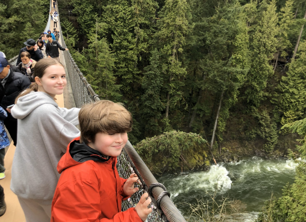 In Vancouver the “fam” took a bus to Canada place and then a shuttle to Capilano suspension bridge park (see photo to the left). Bobby said it was very scary. They got some hot chocolate to warm up and calm down.