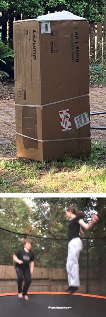 The trampoline arrived in a big cardboard box this morning! Bobby saw it before he left for school this morning so it was a mad rush to get it set up before school was over. The result? Mission accomplished (see photo to the right)! Both kids enjoyed jumping on it. We got it primarily for Bobby with the thought that Katie might enjoy it too, and she said “I can so see myself doing homework or listening to music on it”!