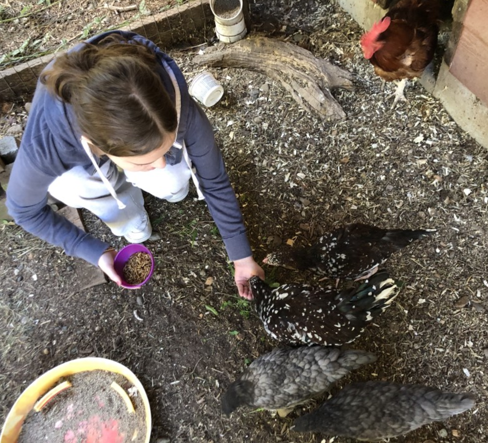 Katie has really taken to the hens. She enjoys feeding them by hand (see photo to the left). Even Valentine gets the special treatment these days.