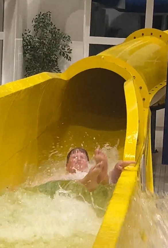 At 7 am the pool opened and “Success”, we were able to beat the crowd. Bobby enjoyed the water slide (see photo to the right) and he and I both enjoyed the regular pool and especially the nice hot jacuzzi. I was joking that what they needed was a car seat with a seat belt, so that it would hold you in place and you could relax and fall asleep without fear of drowning.