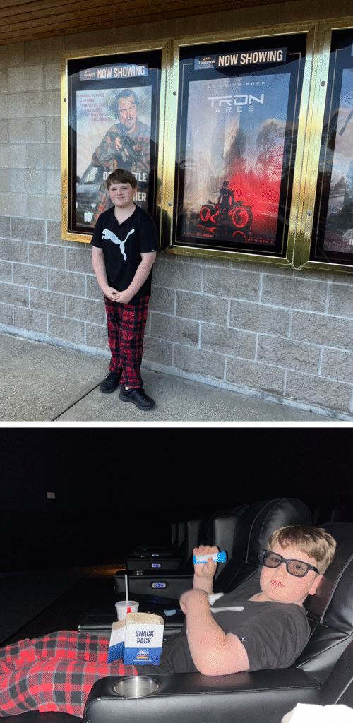 I took Bobby to see the movie “Tron Ares” at Landmark Cinemas in Courtenay this afternoon for Daddy/Son Chat #25. It was 3D so we each picked up a set of glasses. You can see him in the glasses in the photo to the right. He really liked the movie, and especially the cool bikes. Here’s what ChatGPT said about this movie: