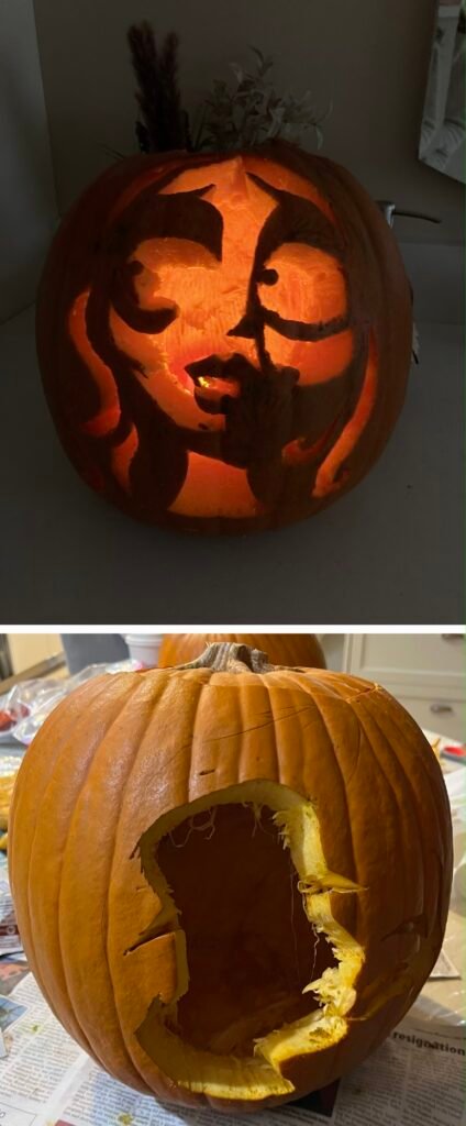 Check out the kid’s pumpkins in the photo to the right. Katie’s is from the movie “Corpse Bride” (top) and Bobby’s is of “Freddie Kruger” (bottom).
