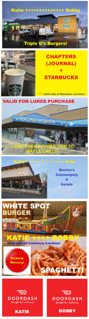 - In terms of individual coupons, there is a Starbucks in Nanaimo that is attached to a Chapters bookstore. I thought Katie might light to drive down there one day, grab a drink, and see if any journals tickled her fancy. It’s a one hour drive, but we sometimes go on three hour drives, so not a big deal. An individual coupon for Bobby consists of purchasing fishing lures and going back to Maple Lake, this time “armed to the teeth” with fishing weapons to “pull in the big one. The orange bate we had last time didn’t seem to work, but fish beware on our next outing. These two coupons went into Day #5.