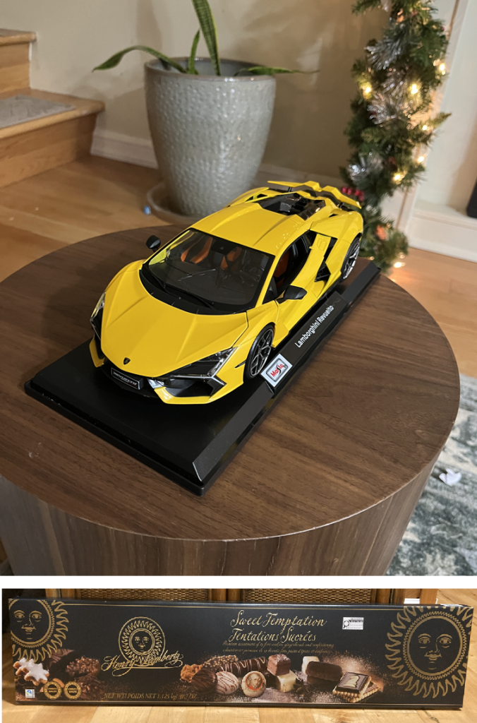While at Costco the other day I picked up a Lamborghini model car for Bobby and a large box of chocolates & cookies for Katie (see photo to the right). I wrapped them up this afternoon and this was their Advent Calendar gift for today. I went to the Dollar Store this afternoon for some gift wrapping and tape, and purchased some more candies for other days on the Advent Calendar as well.