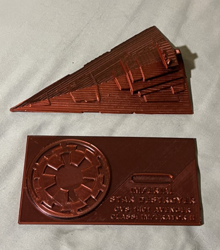 Bobby made a “Star Destroyer” from Star Wars for his friend Isaac on his 3D printer today (see photo to the right). The detail is incredible, but it does take hours to make.
