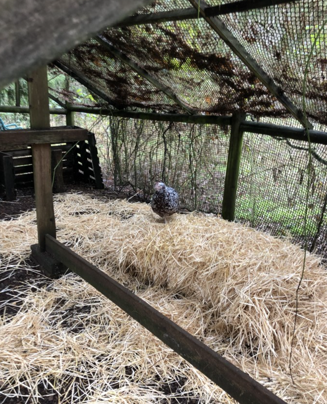 The chickens really destroyed that bale of straw I picked up the other day. Threw it all over the place looking for worms and such… Empress got up and stayed and scanned her world! (see photo to the right).