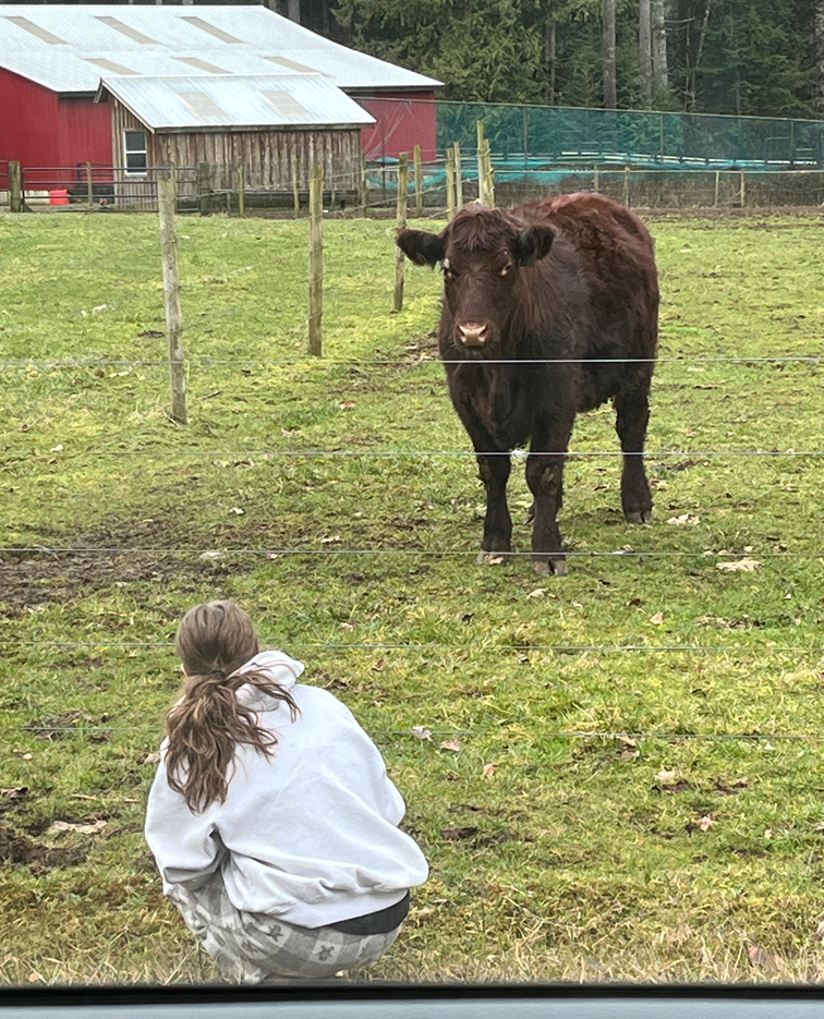 Katie is suffering from “imposter” syndrome today so we went for a drive. Apparently “imposter” syndrome is more common with girls. She saw a cow on Dove Creek Road and got out to go say hi (see photo to the right).