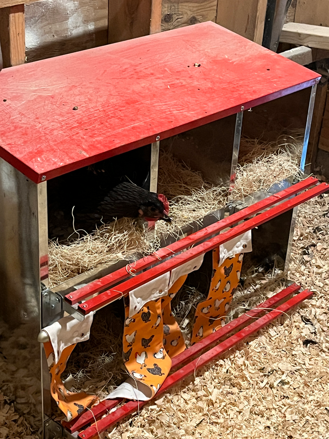 Morticia, one of our hens, is 1 years old, and was in the nesting area this morning (see photo to the left). She laid eggs before, but for the previous owner, not for us. She is a “Black Copper Maran” mix and her eggs should be very dark brown, almost chocolaty. By the end of the day no eggs so we will have to watch her to see that the egg doesn’t get stuck. If it does get stuck the hen will die in two days.