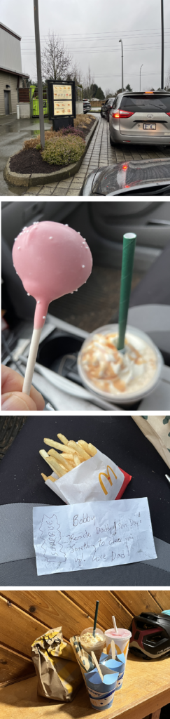 Everyone in the “Main House” is sick, so I thought I would do a “Remote Order Run” for food. It started off at Katie’s request for a drink, but ended up as a medium caramel frappuccino and birthday cake pop for her at Starbucks. I thought I would surprise Bobby with a treat as well so I picked up a $5 McDouble Value Meal for him and a regular Oreo McFlurry. I called Bobby up on Alexa later in the day and we discussed this surprise meal and the note I attached to the fries (see photo to the right), so can we call this Daddy/Son Day #102? Oh, and Katie decided that she wanted an Oreo McFlurry as well.