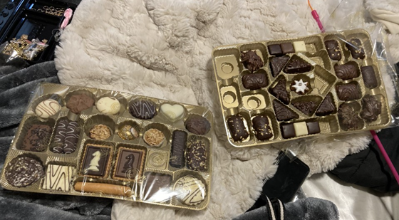 Remember the large box of chocolates and cookies that I picked up for Katie’s Advent Calendar last year? Well, she got into them today (see photo to the right).