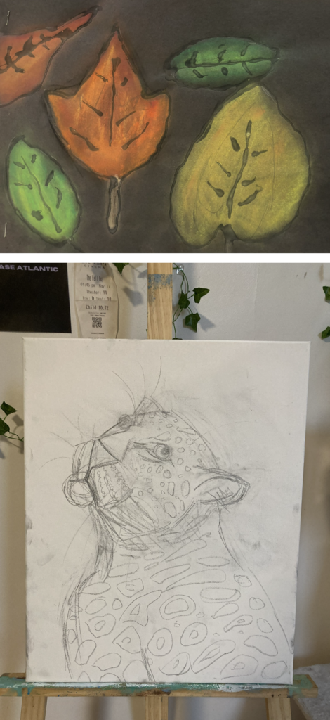 Just after noon today my wife and I were scheduled to go meet Bobby’s teachers. I seem to have caught (eventually) what the whole family is struggling with and was too sick to attend. My wife took a picture of Bobby’s art (see photo to the right). While at home Katie drew a beautiful picture of a leopard, which you can see below it.