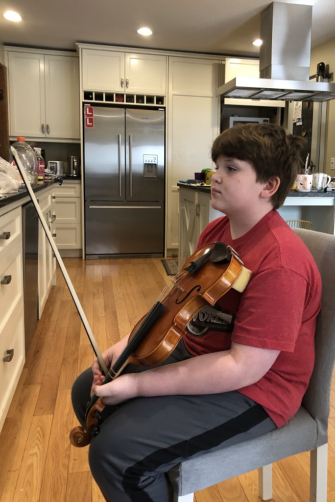 Bobby is really enjoying his new Garmin watch. For some reason you can only text a few pre-recorded phrases, or record a little voice recording and send that. He texted my wife just before lunch today and came home sick. She gave him some painkillers and put him to bed. He did his violin class online this evening (see photo to the right).