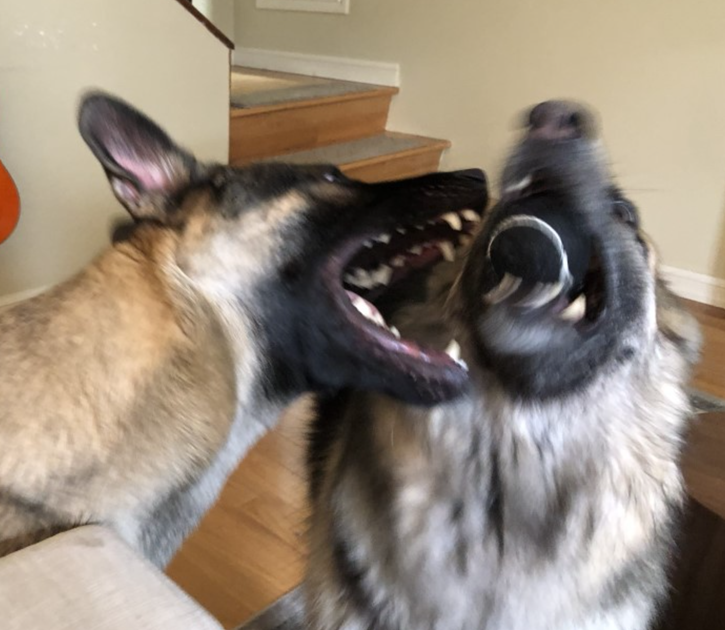 My wife, Katie, and Bobby, went over to see our neighbor Carolyn this evening. She was saying how Finn, the dog who comes to play with Nishka, is not only obsessed with Barney the cat, he starred at her riding helmet for 3 hours the other day! Katie was saying how she wants to go out with Carolyn to see the horses at the farm she works at. You can see Nishka & Maple having some “doggie fun” in the photo to the left.